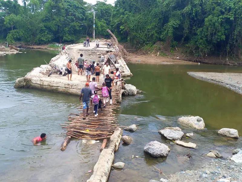 Ante la falta de respuesta de las autoridades luego del colapso del puente de Bayacanes conocido como “El Badén” sobre el río Camú, cuatro jóvenes hicieron una escalera o puente de tablitas para facilitar el paso a los comunitarios por la carretera que conecta al municipio de La Vega con Jarabacoa.