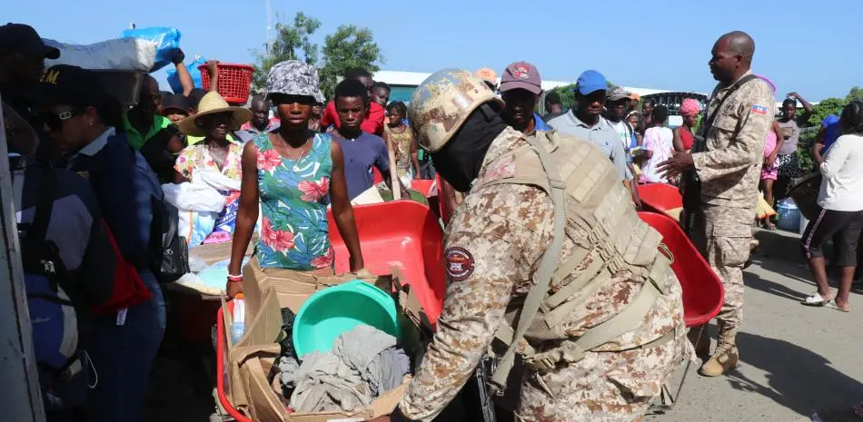 Utilizando mascarillas y guantes de nitrilo, militares del Cuerpo Especializado en Seguridad Fronteriza Terrestre (Cesfront), colocados en el paso fronterizo, verifican e impiden que haitianos ingresen al país con alimentos cocidos, carnes o animales.