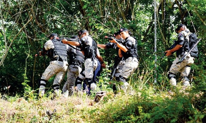 De forma cuidadosa, protegiéndose de uno a otros, avanzaban a una casa: No era un simple ejercicio cotidiano. Se trataba del rescate de un rehén. Después de contar de 1 al 5, de forma interactiva, sonó el primer disparo con municiones de salva.