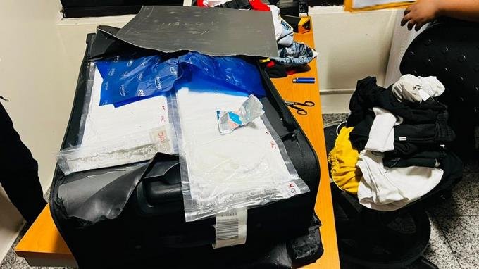 Cuando las autoridades iniciaron el proceso de revisión en presencia de un fiscal adjunto, descubrieron un doble fondo en una maleta, donde se ocuparon tres láminas que se presumen es cocaína, con un peso preliminar de 2.38 kilogramos.