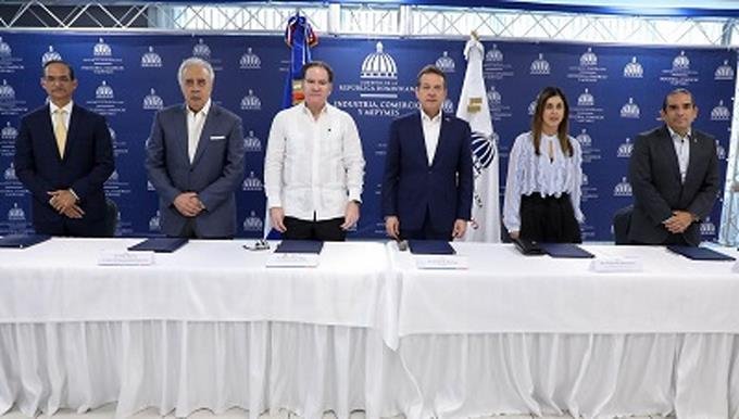 El ministro Víctor -Ito- Bisonó, junto a los empresarios Manuel Corripio, vicepresidente ejecutivo del Grupo Corripio; Félix García, presidente de Grupo Linda; Alejandra Betancourt, directora financiera de Molinos Modernos; Manuel Pozo Perelló, presidente ejecutivo de Industrias Banilejas (Induban), y Pablo De los Santos, director de Manufactura de La Famosa, firmaron un memorando de entendimiento en la sede del ministerio.