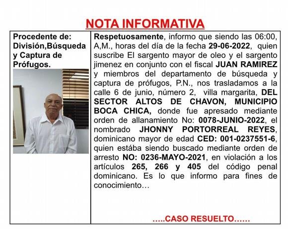 Esos cumplieron con la orden de allanamiento número 0078-junio-2022 y con la orden de arresto 0236 de mayo del 2021, que acusan al detenido de violar los artículos 265,266 y 405 del Código Penal Dominicano, dice el documento.