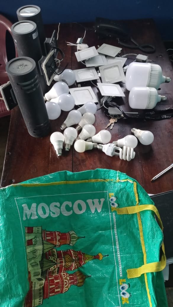 Al momento de su detención, se le ocupó un bulto verde, que contenía en su interior tres lámparas y veinte bombillas, supuestamente sustraídas de la Ferretería Espinal.