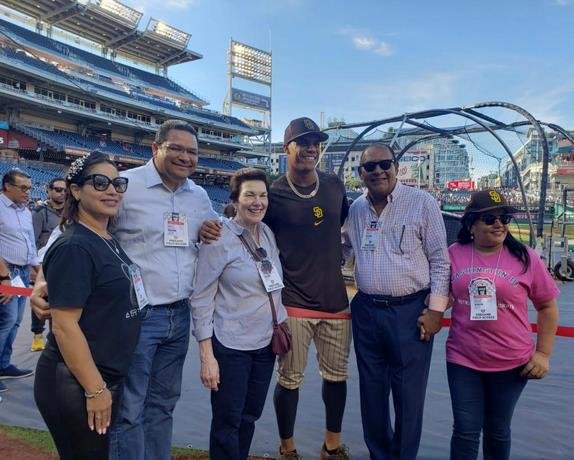 El director de LISTÍN DIARIO, Miguel Franjul, y la embajadora dominicana en Washington, Sonia Guzman,junto al pelotero Juan Soto, de los Padres de San Diego. También figuran Gedeon Santos, exembajador dominicano en Washington y esposa y Wendy de Franjul.