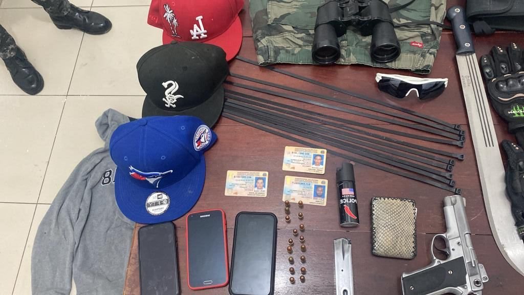 También se les ocupó la pistola marca Smith Wesson, calibre 9mm., numeración ilegible, diez cápsulas 9mm, tres teléfonos celulares, diez tairras, unos binoculares, un aerosol de gas pimienta, un pantalón tipo militar, color verde camuflaje, unos guantes negros, un abrigo, cuatro gorras de diferentes marcas y colores y un arma blanca (colin), de 17 pulgadas de largo.