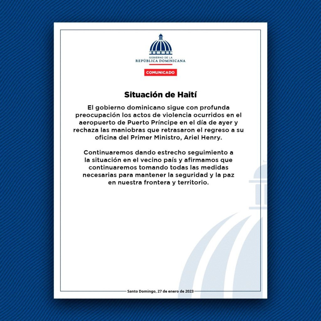 «El Gobierno dominicano sigue con profunda preocupación los actos violencia ocurridos en el aeropuerto de Puerto Príncipe en el día de ayer y rechaza las maniobras que retrasaron el regreso a su oficina del primer ministro, Ariel Henry.