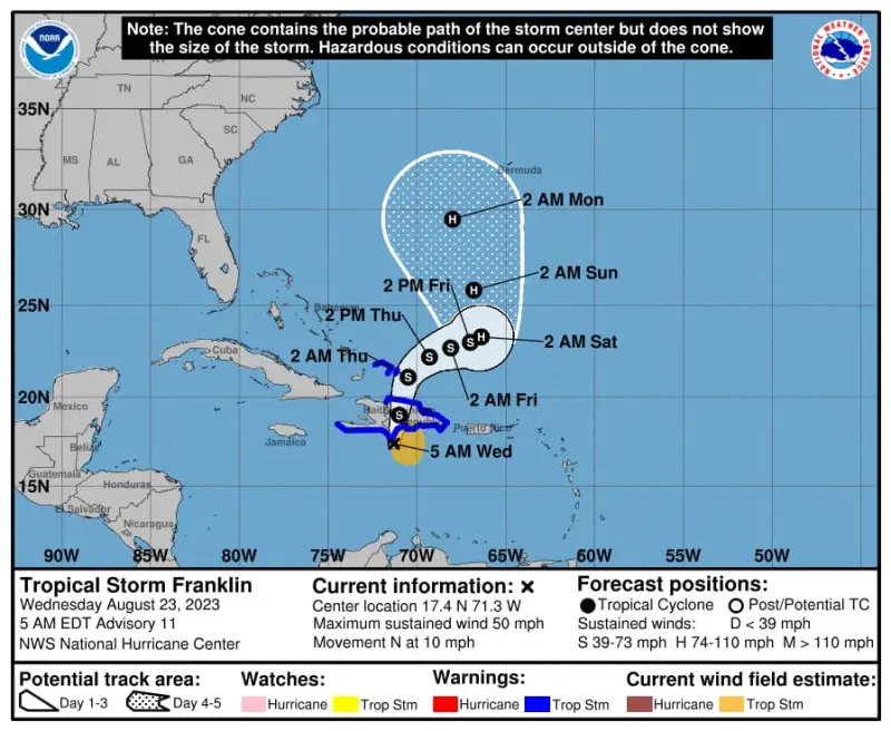 En la trayectoria prevista, se espera que el centro de Franklin cruce la isla Hispaniola este miércoles y emerja sobre las aguas del suroeste del Atlántico más tardar hoy o esta noche.