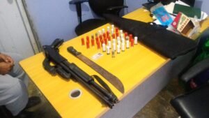 Durante la pesquisa, agentes preventivos, de investigaciones y de inteligencia delictiva, junto al Ministerio Público, ocuparon en la vivienda una escopeta sin documento, 41 cartuchos para la misma y un arma blanca, tipo machete.