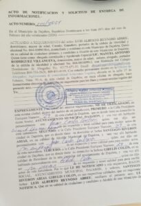 El alcalde Santiago Riveron y la presidenta de la Sala Capitular del ayuntamiento de este municipio, Gilbelys Colón, fueron notificados mediante auto de alguacil, para que entreguen informaciones publicas concernientes a la institución, de conformidad a lo establecido en los artículos 1,2 y 4 de la Ley General de Libre Acceso a la Información Pública, 200-04.